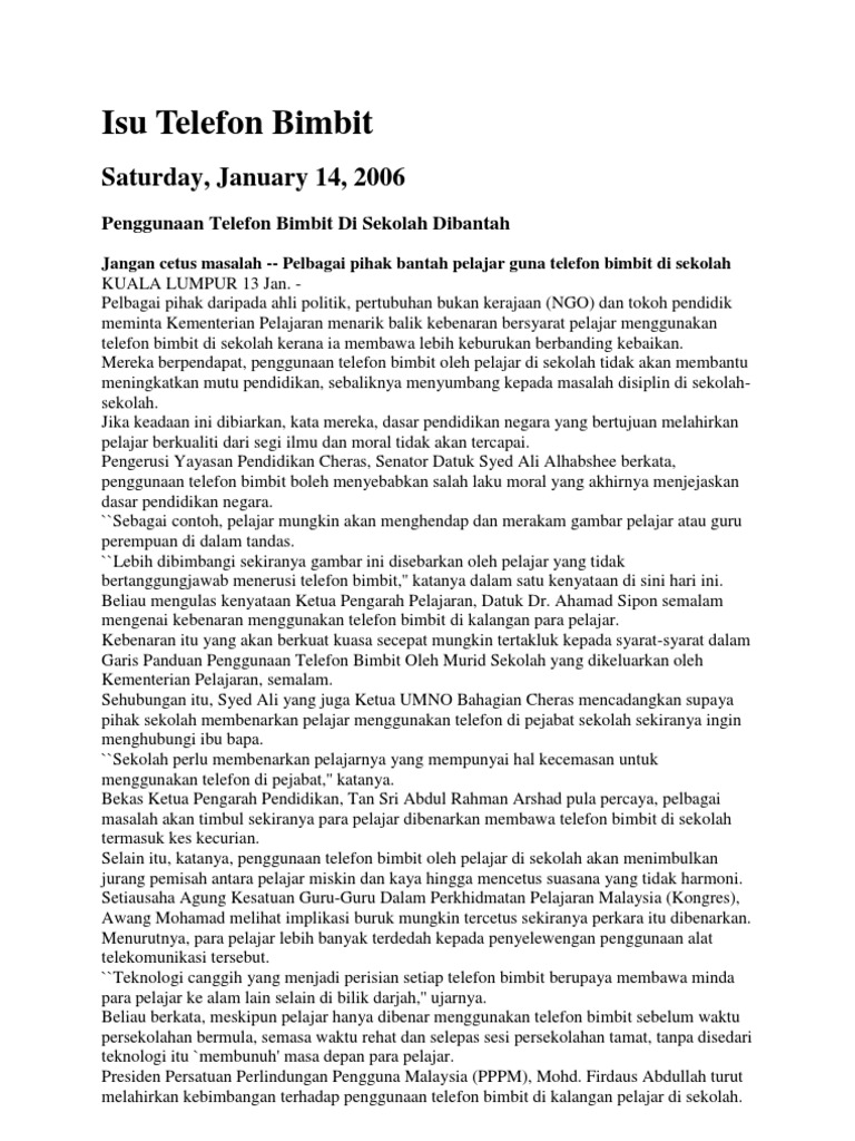 Astro awani (gambar sekadar hiasan). Adapun perbuatan menggunakan telefon bimbit ketika khatib membaca khutbah jumaat boleh diqiyaskan kepada maksud sebuah hadits sahih yang diriwayatkan daripada abu hurairah radhiallahu 'anhu, bahawasanya nabi shallallahu 'alaihi wasallam telah bersabda Seterusnya, apabila menggunakan telefon bimbit dengan kerap, pelajar akan terdedah dengan masalah kesihatan. Ada juga yang melayari internet melalui telefon bimbit. Cuma penggunaannya terbatas di luar sekolah kerana mereka dilarang menggunakannya di kawasan sekolah.